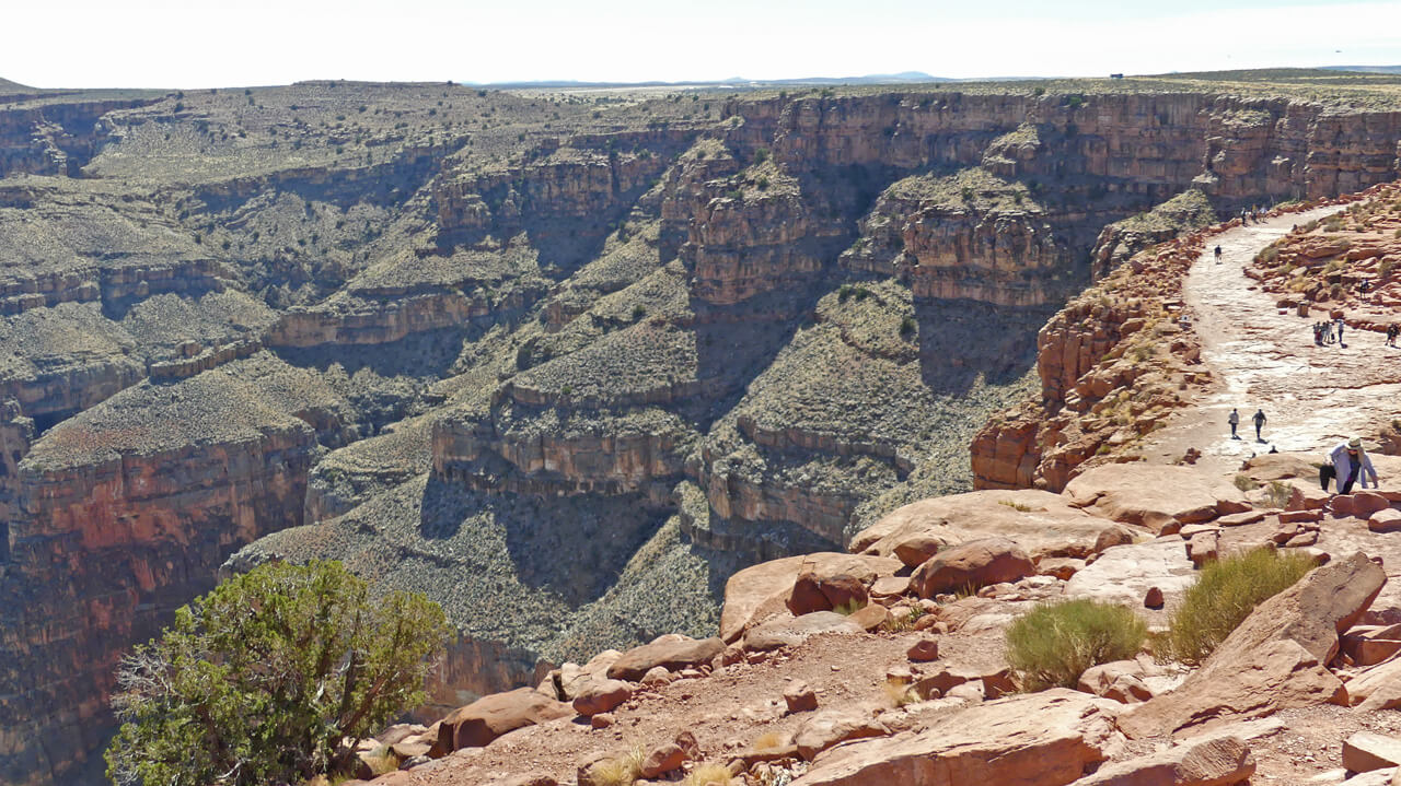 This is the location of the Skywalk and Visitors Center. The Skywalk is a glass-bottom balcony that overhangs the Grand Canyon. It provides an aerial view of the Grand Canyon; it is an additional price to access the Skywalk.