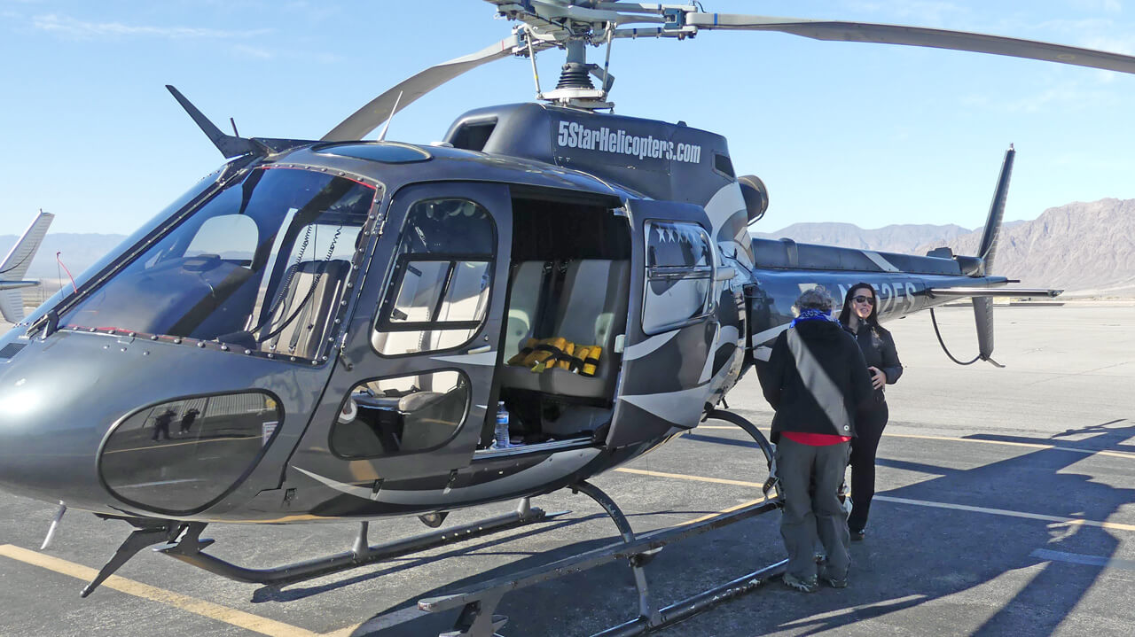 5-Star helicopter van picked us up at our Campground on Lake Mead, which is close to their airstrip. Passengers are also picked up in executive cars serving Las Vegas – 35 minutes east of the airstrip. Upon arrival at their comfortable lounge at the airstrip, we checked in, and confirmed our weight; it is critical for planning weight distribution for a safe helicopter journey for each passenger to weigh in – you don’t have to see the number on the scale.
